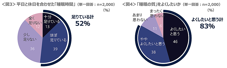 平日と休日を合わせた“睡眠時間”の過不足は、「十分+ほぼ足りている」が52%、「少し+全く足りない」が48%と拮抗している。“睡眠の質”をよくしたいかと聴取した結果は「よくしたいと思う計」83%と多数である。<図3、4>