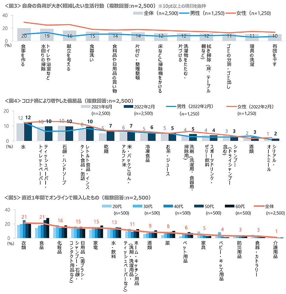 自分の負担が大きく軽減したいと思っている行動は「食事を作る」「水回りの掃除」「献立を考える」が多い。女性においては、この3つの行動が負担と実感している人が4に1人と高く、男性の割合と乖離している。コロナ禍により増やした備蓄品は、「水」「ティッシュ・トイレットペーパー」「石鹸・ハンドソープ」「レトルト食品・インスタント食品・缶詰」などである。2021年8月の調査結果と比べると、値上ラッシュや自宅療養者が増えたことも遠因してか、備蓄する割合が全体的に高まっていた。<図3、4>