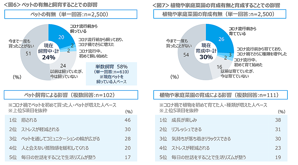 現在ペットを飼っている人は24%。ペットのいる家庭の「単数飼育」は58%であり、飼育することにより「癒される」「ストレスが軽減される」「ペットを通じてコミュニケーションの輪が広がる」と回答。<図6>