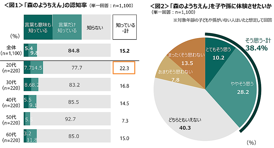図1 「森のようちえん」の認知率、図2 「森のようちえん」を子や孫に体験させたいか