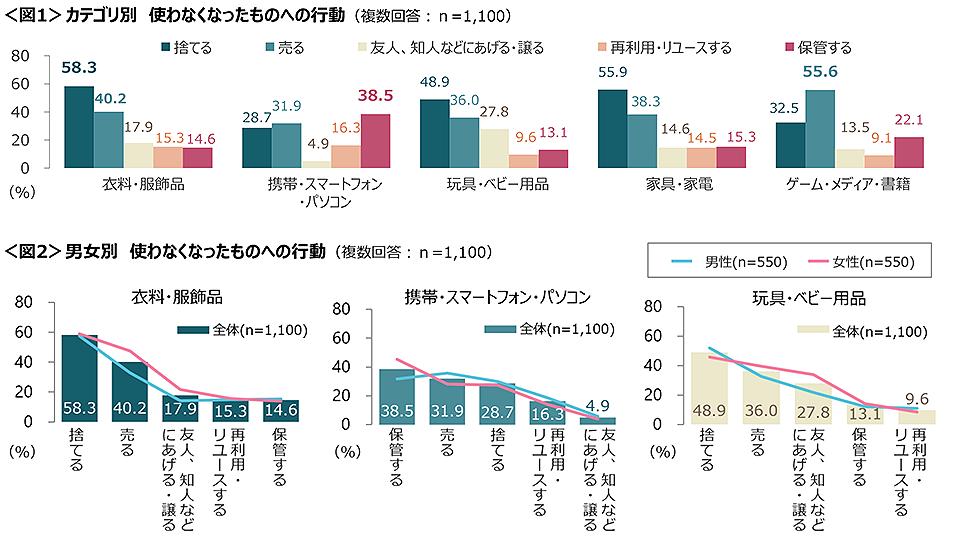 男女別で見ると、女性は「衣服・服飾品」は“売る”、「携帯・スマートフォン・パソコン」は“保管する”、「玩具・ベビー用品」は“あげる・ゆずる”が高く、男女差も見られた。<図2>