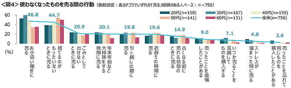 年代別で見ると、20~30代の若者ほど、もったいなさよりお小遣い稼ぎが勝る様子。一方、50~60代は「捨てるのがもったいないときに売る」が高い。<図4>