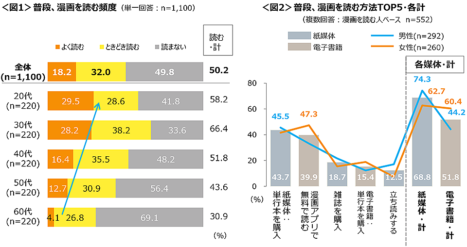 図1 普段、漫画を読む頻度、図2 普段、漫画を読む方法TOP5・各計