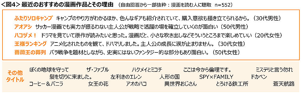 ◆最近のおすすめの漫画作品を聴取したところ、映画化・ドラマ化した作品や今年からアニメが始まった作品などをあげる声が多い。<図4>