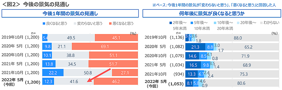 一方、景気の見通し「悪くなると思う」が半年間で19ptの増加