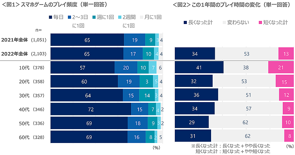 1年前と比較したプレイ時間は、「長くなった」が34%、10代(15~19歳)や30代でプレイ時間が長くなった人が多い。<図2>