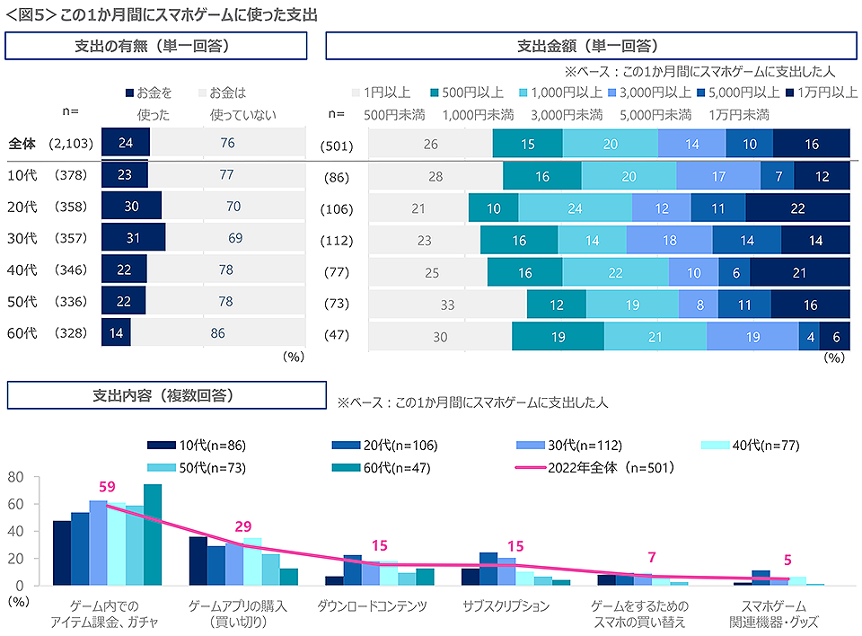 この1か月の間にスマホゲームにお金を使った人は24%。年代別には、20代・30代が多く、60代が最も低い。支出額は、「月に500円未満」が概ね全年代で多いが、20代と40代は「月に1万円以上」支出する人も2割を占めた。支出内容は、「ゲーム内でのアイテム課金、ガチャ」が59%と多く、「ゲームアプリの購入(買い切り)」が29%、「ダウンロードコンテンツ」と「サブスクリプション」が15%と続く。60代は「ゲーム内でのアイテム課金、ガチャ」の支出は高いが、他の支出は低い。<図5>