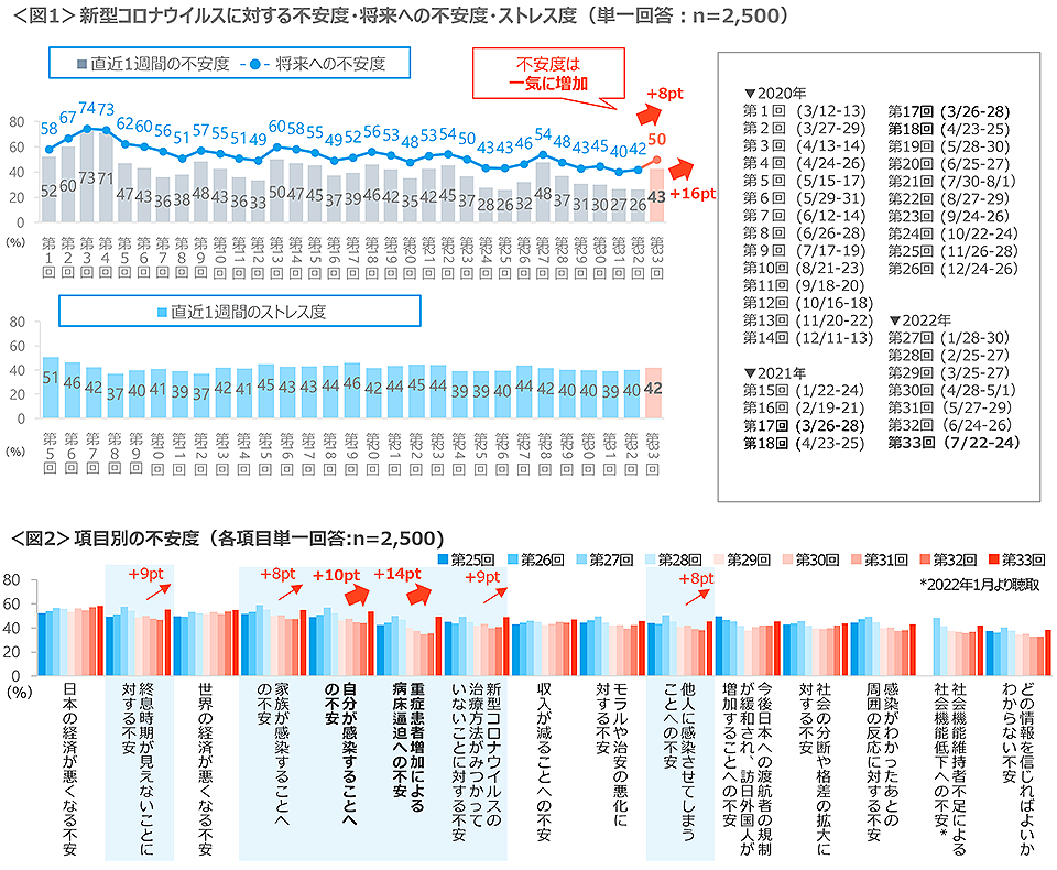 株式会社クロス・マーケティング(本社:東京都新宿区、代表取締役社長:五十嵐 幹)は、新型コロナウイルスが消費者の行動や意識に与える影響の把握を目的として、全国47都道府県に在住する20~69歳の男女2,500人を対象に「新型コロナウイルス生活影響度調査」を第1回(2020年3月12日~13日)から定期的に実施。2022年7月の第33回は、多数の都道府県において過去最多の感染者数を更新し、全国感染者数が20万人前後と急増している7月22日~24日に調査を行い、人々の意識・行動について分析しました。