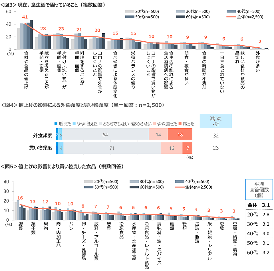 食生活の困りごとは「食材や食品の値上げ」が最も高く、次いで「献立を考えることが面倒」「片付けが面倒」など。60代は「食材や食品の値上げ」「外食がしにくい」「食べすぎによる体型変化」が他世代より突出して高い。<図3>