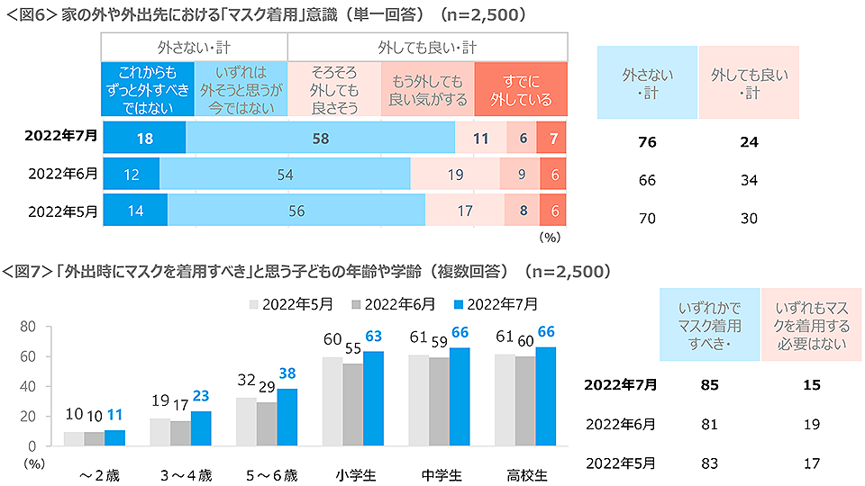 外でマスク着用すべき子どもの年齢は、先月から増加に転じた。小学生以上で6割超え、5~6歳でもマスクを着用すべきは38%におよんだ。<図7>