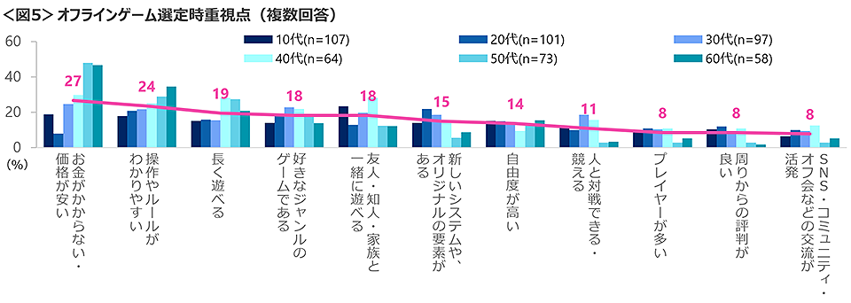 オフラインゲームを選ぶ理由は、「お金がかからない・価格が安い」が最も高く、次いで「操作やルールがわかりやすい」「長く遊べる」「好きなジャンル」「友人・知人・家族と一緒に遊べる」など。60代は「お金がかからない・価格が安い」「操作やルールがわかりやすい」、40代は「友人・知人・家族と一緒に遊べる」の理由が目立った。<図5>