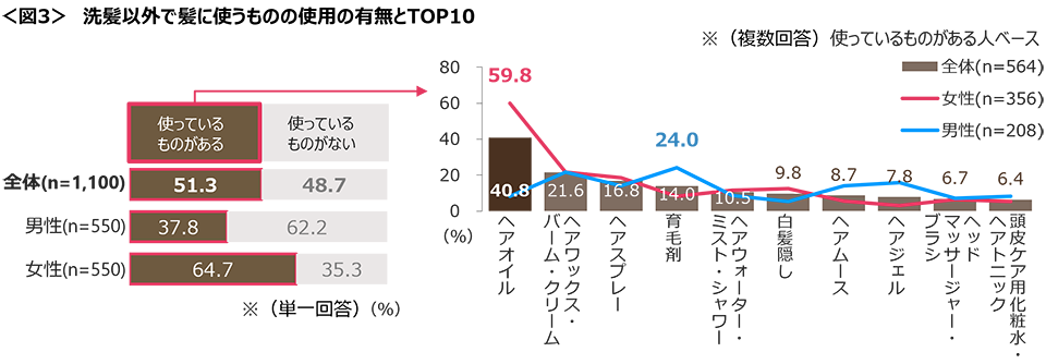 図3 洗髪以外で髪に使うものの使用の有無とTOP10