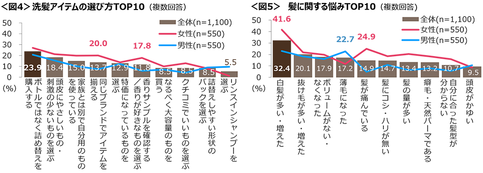図4 洗髪アイテムの選び方TOP10、図5 髪に関する悩みTOP10
