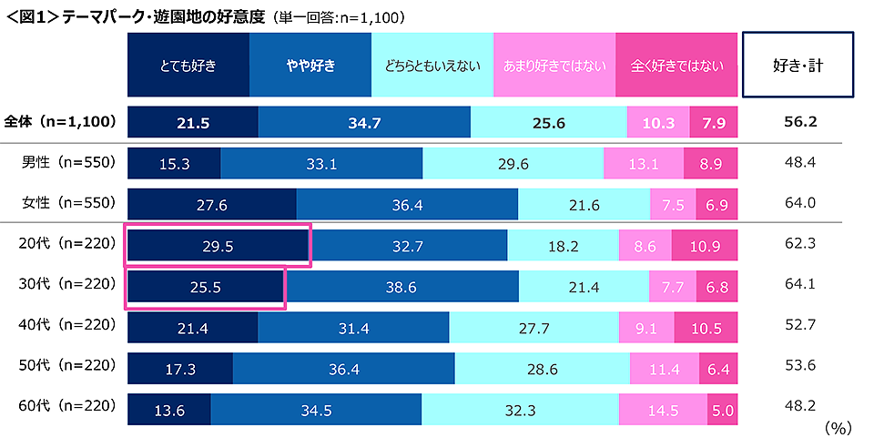 ◆テーマパーク・遊園地が好きな人(とても+やや好き)は56.2%。特に女性は64.0%と高い。<図1>