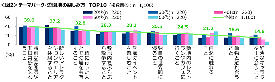 20代は「新しいアトラクションやエリアを体験すること」が特に高く、「敷地内をぶらぶら散歩すること」は他の年代より低め。30代は「一緒に行った人とその場を共有すること」、60代は「自然に触れること」が他の年代より高い。