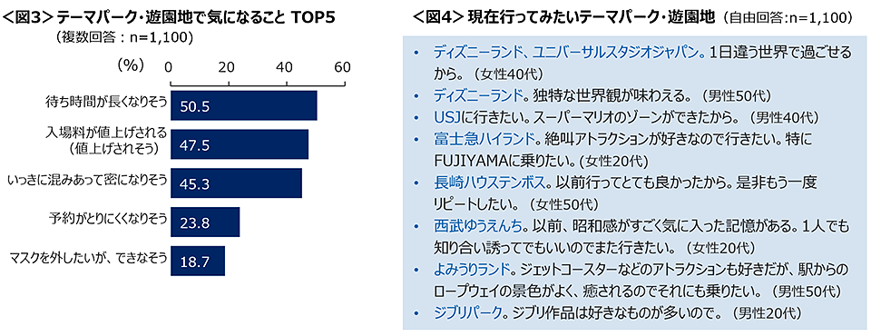 図3 テーマパーク・遊園地で気になることTOP5、図4 現在行ってみたいテーマパーク・遊園地