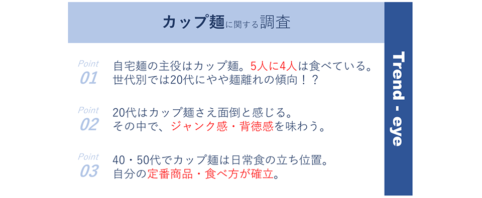 直近、寒暖差が大きい日々が続いているなかで存在感の高まる「カップ麺」。普段から生活者にとって身近でありますが、どのように生活に入り込んでいるかを見つめることで消費観の考察を行います。