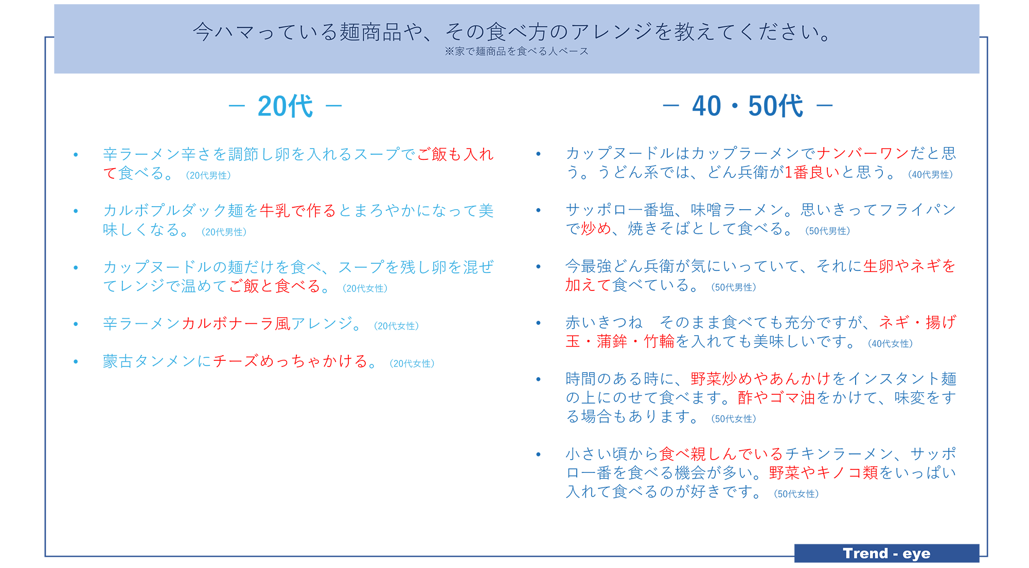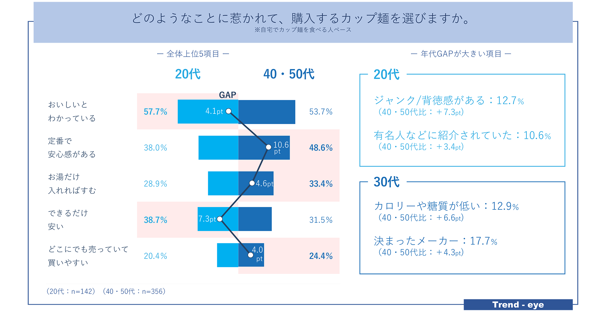 ハマっている商品や食べ方を比較しても、40・50代が定番品を使って手軽な食事を作ろうという様子であるのに対し、20代は自分なりのギルティフードを作っているような感覚であることが見て取れる。