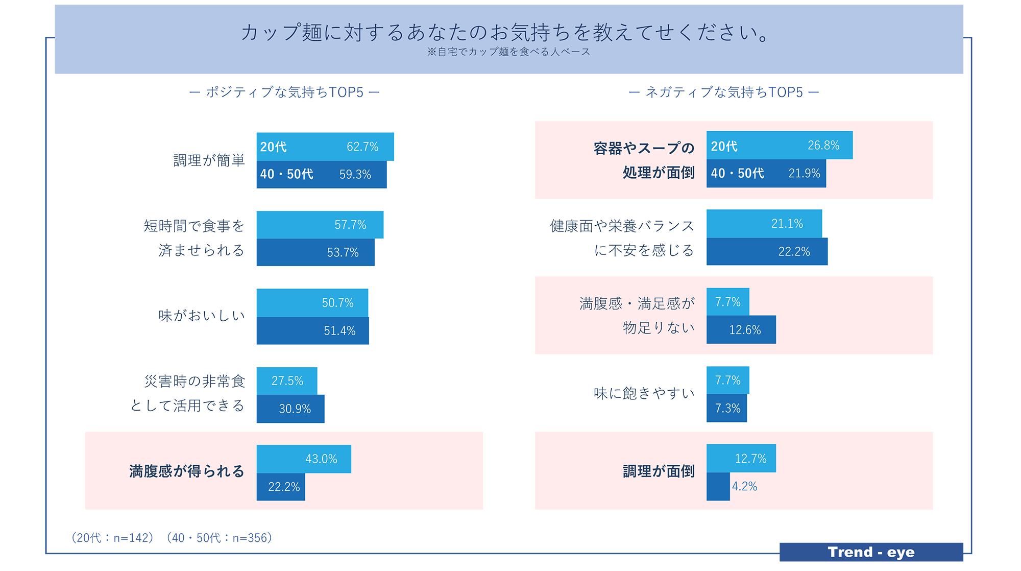 カップ麺に対する気持ちを良い面も悪い面も質問したところ、20代は「満腹感が得られる」一方で「調理したり片づけるのが面倒」という傾向が強い。手軽とは言えないものの、背徳感を味わうには手を出しやすいと感じている様子。