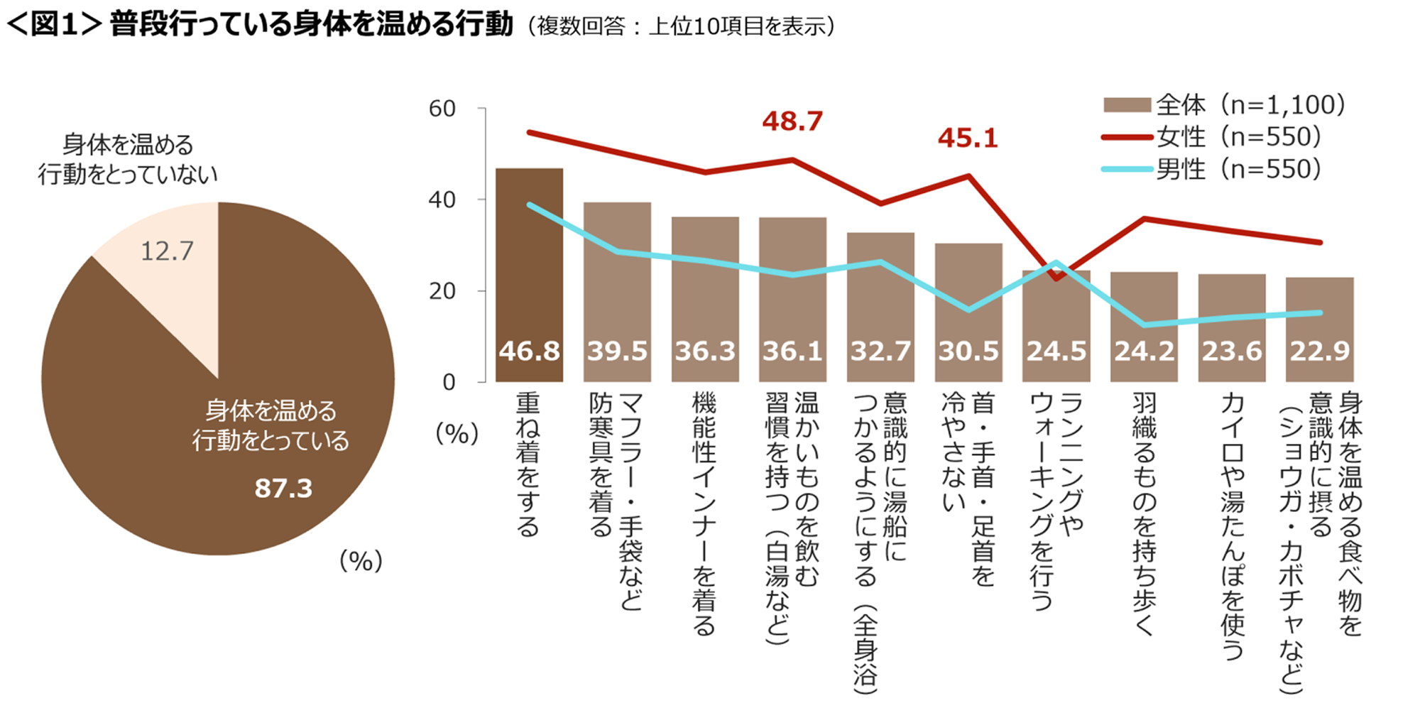 ◆身体を温める行動をとっている人は87.3%。「重ね着をする」「マフラー・手袋など防寒具を着る」「機能性インナーを着る」が上位にあがる。<図1>