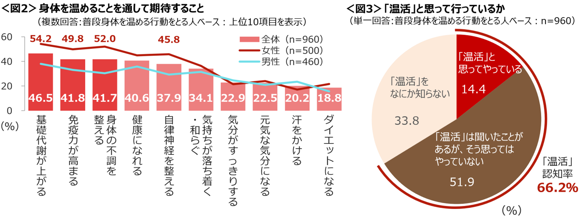 図2 身体を温めることを通して期待すること、図3 「温活」と思って行っているか