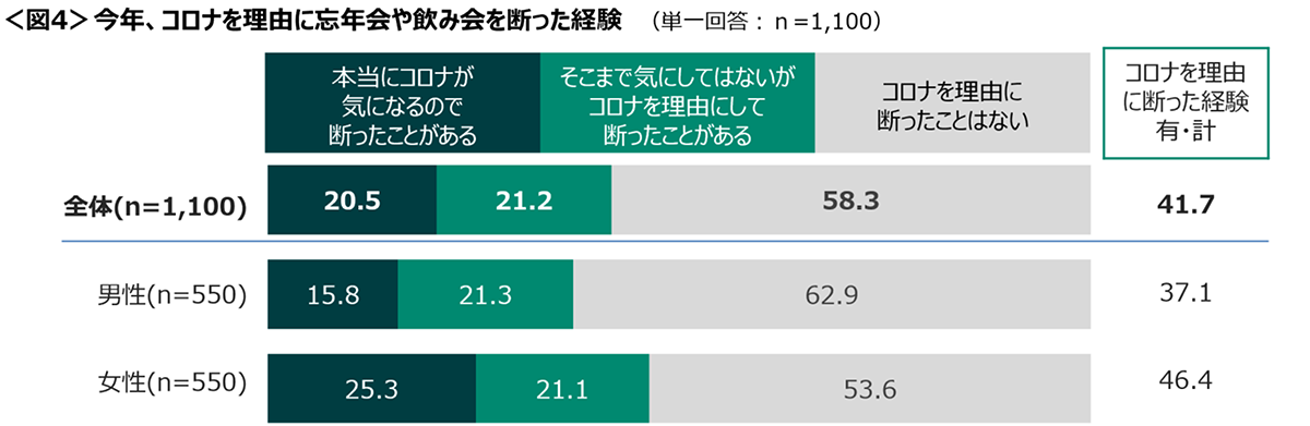 ◆コロナを理由に忘年会や飲み会を断った経験がある人は41.7%。そのうち、「本当にコロナが気になるので断ったことがある」人は20.5%であり、女性の割合が多い。<図4>