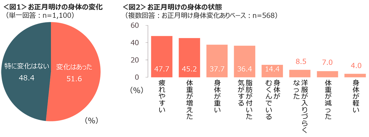 ◆お正月明けの身体の状態は、「変化あり」が半数超え。「疲れやすい」「体重が増えた」が4割台。<図1・図2>