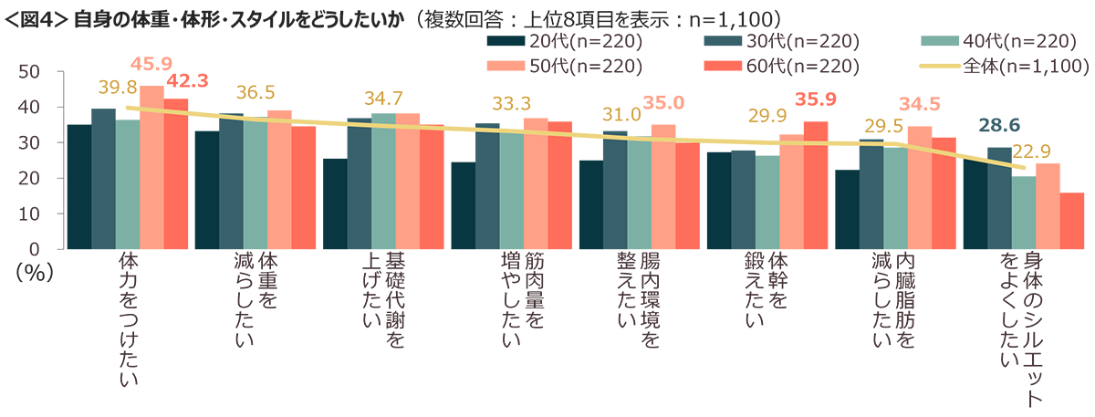 年代別でみると、30代は「身体のシルエットをよくしたい」、50代は「体力をつけたい」「腸内環境を整えたい」「内臓脂肪を減らしたい」、60代は「体力をつけたい」「体幹を鍛えたい」の割合が高い。