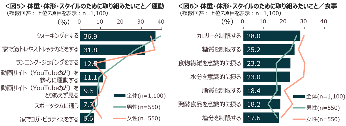 図5 体重・体形・スタイルのために取り組みたいこと/運動、図6 体重・体形・スタイルのために取り組みたいこと/食事
