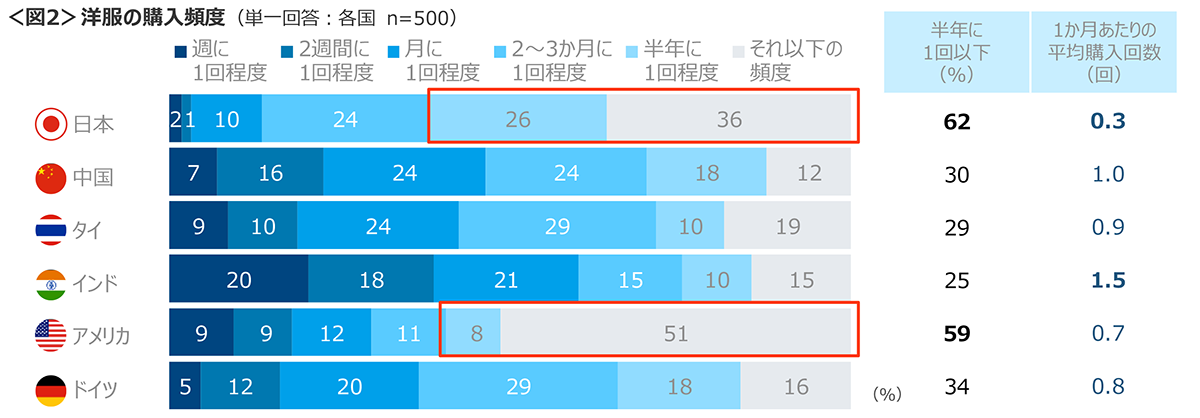 洋服の購入頻度は、インドが極めて高く、日本は最も低い。「半年に1回以下(半年に1回程度+それ以下の頻度)」は、日本が62%、アメリカが59%と半数を超える。中国、タイ、ドイツは、「月に1回程度」と「2~3か月に1回程度」が、ボリュームゾーンである。<図2>