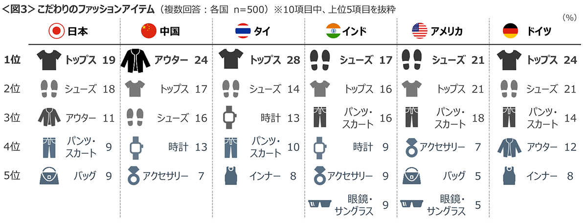 10種類のファッションアイテムへのこだわりを聴取した。日本、タイ、インド、アメリカ、ドイツの5か国は、「トップス」と「シューズ」が1~2番手である。中国のみ「アウター」がTOPにあがる。中国、タイは「時計」の割合が10%台と他国よりも高い。<図3>