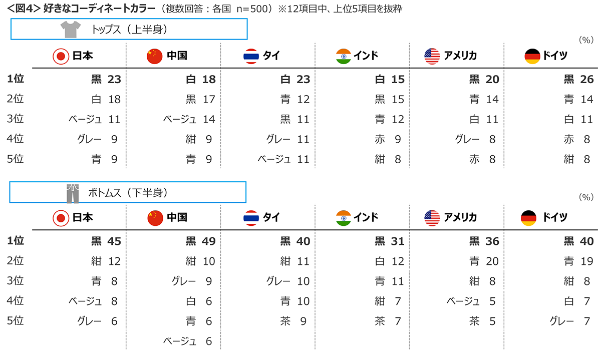 トップスとボトムスに分けて、12色の中で好きなコーディネートカラーを確認した。トップスでは、各国とも「黒」と「白」がトップ3に入る人気色。「黒」が1番となったのは日本、アメリカ、ドイツで、日本を除くアジア3か国は「白」が1番であった。タイ、インド、アメリカ、ドイツでは純色の「青」が、日本と中国は中間色の「ベージュ」がトップ3にランクイン。一方、ボトムスは、6か国ともにコーディネートしやすい「黒」が1番となった。次いで「紺」をあげたのは、日本、中国、タイ。インドは、国旗で平和を意味する「白」が2番手にあがった。<図4>