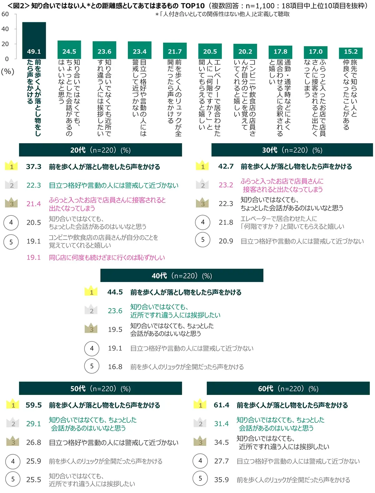 ◆知り合いではない人との距離感、関わり方を聞いたところ、「前を歩く人が落とし物をしたら声をかける」が5割でTOP。<図2>