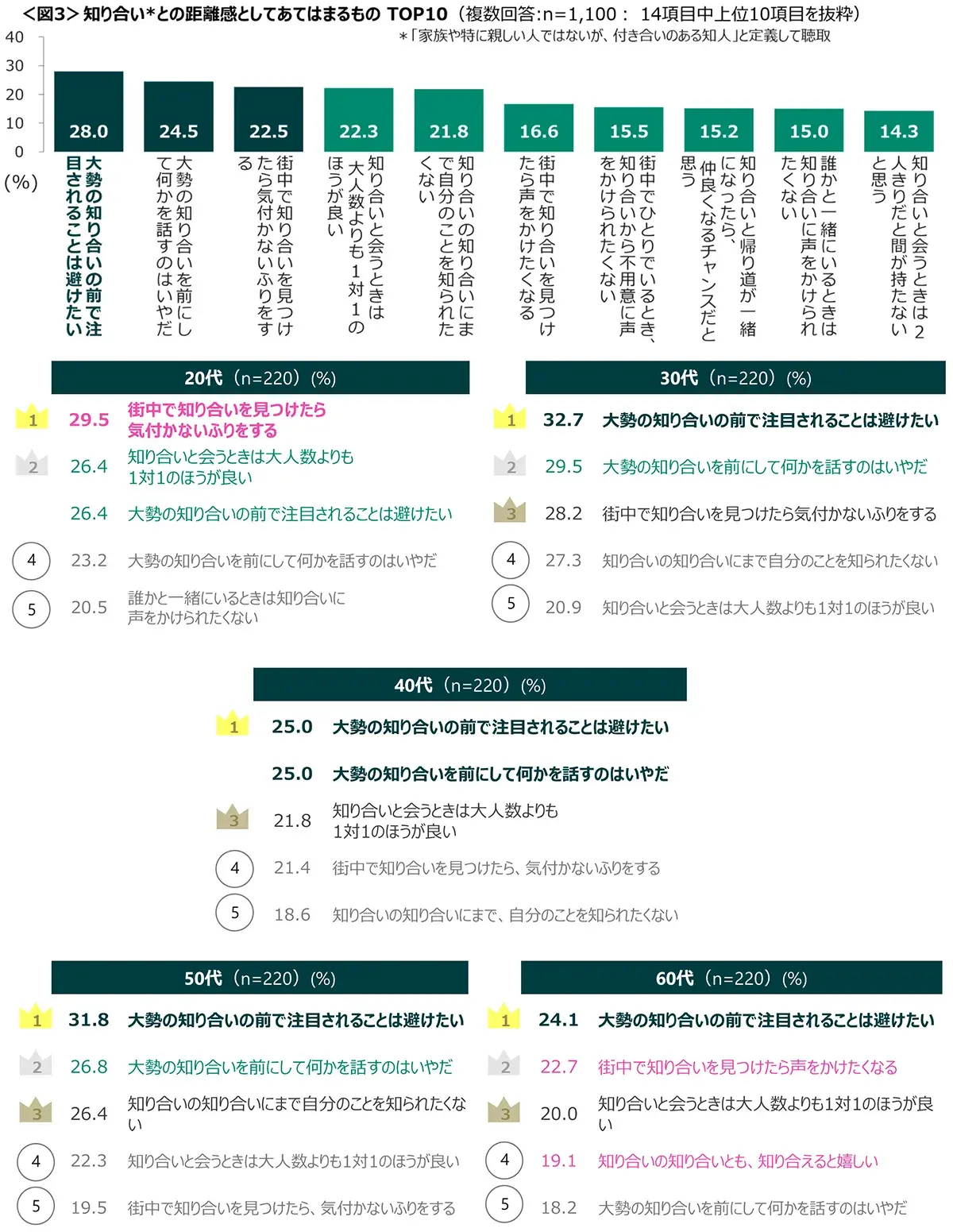 ◆知り合いとの距離感、関わり方としては、「大勢の知り合いの前で注目されることは避けたい」「大勢の知り合いを前にして何かを話すのはいやだ」「街中で知り合いを見つけたら気付かないふりをする」がTOP3。<図3>