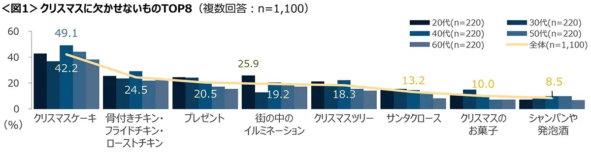 「クリスマスケーキ」は、40代で特に高く49.1%と半数。「街の中のイルミネーション」は20代で25.9%と、他の年代に比べ高い。