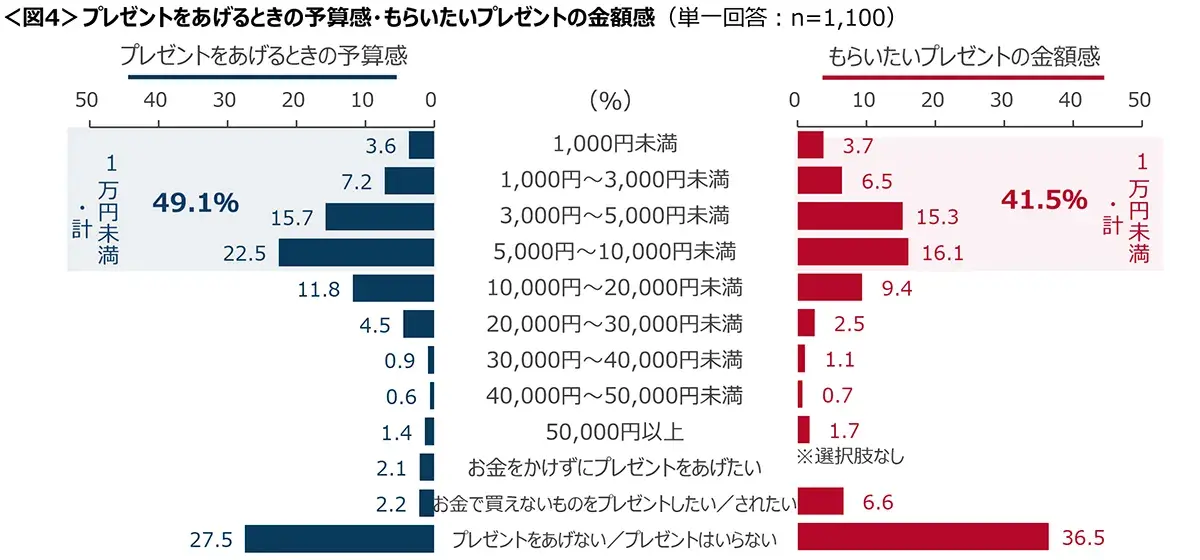 プレゼントをあげるときの予算感は1万円未満との回答が約半数。また、もらいたいプレゼントの金額感は、「5,000円~10,000円未満」が16.1%、「3,000円~5,000円未満」が15.3%で1万円未満の回答は41.5%だった。