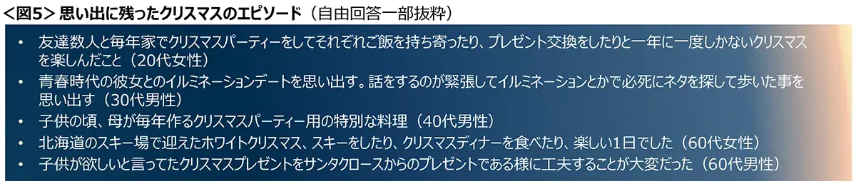 ◆クリスマスの思い出として「クリスマスパーティーをした」「パートナーと特別な一日を過ごした」などのほかに「サンタクロースからのプレゼントのように工夫するのが大変だった」といった声もあがった。<図5>