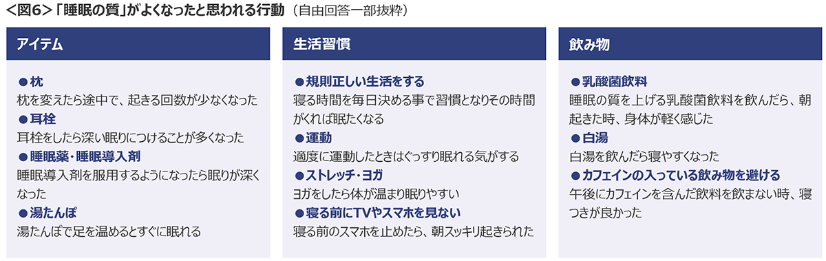 朝すっきりと目が覚める、すぐに眠りにつく、夜中に目が覚めない、熟睡できるように、「枕を変えた」「規則正しい生活をする」「運動をする」「乳酸菌飲料や白湯を飲む」などの声があがった。<図6>