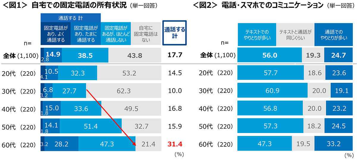 固定電話の保有率は40代以上で半数を超える。通話利用は、利用率が高い60代でも3割にとどまる。<図1>