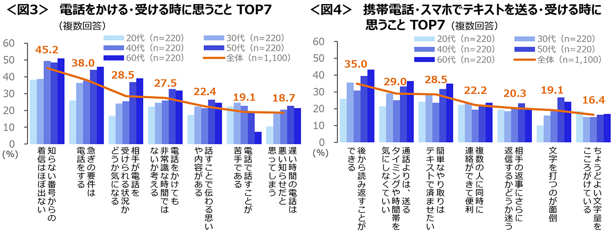 特に50~60代は「後から読み返すことができる」「通話よりは、送るタイミングや時間帯を気にしなくていい」「簡単なやり取りはテキストで済ませたい」「文字を打つのが面倒」が高め。<図4>