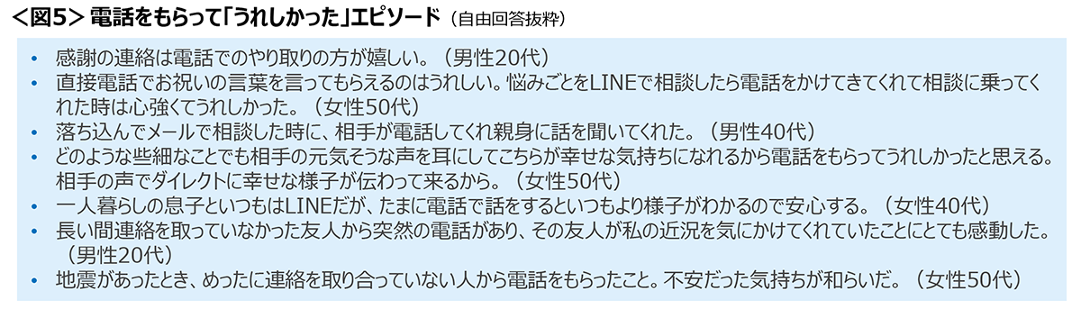 ◆電話をもらって「うれしかった」エピソードは、お祝いやお礼を伝えられたことに関するコメントが多くあがった。普段あまり連絡をとっていない人から久しぶりに電話があり喜ばしく感じたという声もみられた。<図5>