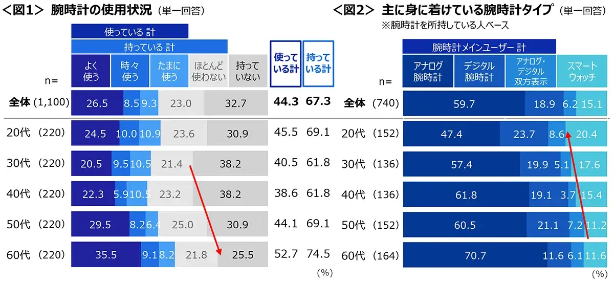 ◆腕時計またはスマートウォッチを持っている人は67.3%、普段使っている人は44.3%。