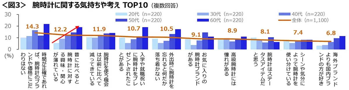 年代が高くなるほど「腕時計に対する興味・関心が薄れている」という意識も高まっている。<図3>