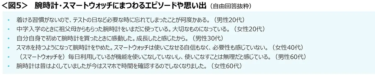◆思い出・エピソードとしては、「お祝いや記念日に購入した(してもらった)」といった購入やプレゼントにまつわるコメントが多くみられた。また使用頻度減少の理由として「スマートフォンで代用できる」という声も少なくなかった。<図5>