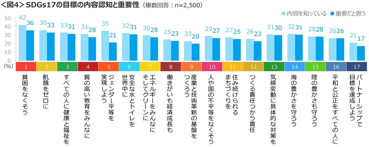 SDGsの17の目標のうち“内容を知っている”ものは、「1.貧困をなくそう」「2.飢餓をゼロに」「5.ジェンダー平等を実現しよう」が上位。“重要だと思う”ものは、「1.貧困をなくそう」「2.飢餓をゼロに」「3.すべての人に健康と福祉を」「6.安全な水とトイレを世界中に」「14.海の豊かさを守ろう」「13.気候変動に具体的な対策を」で3割台。内容認知で3番手にあがった「5.ジェンダー平等を実現しよう」の重要と思うは割合は21%と低い。<図4>