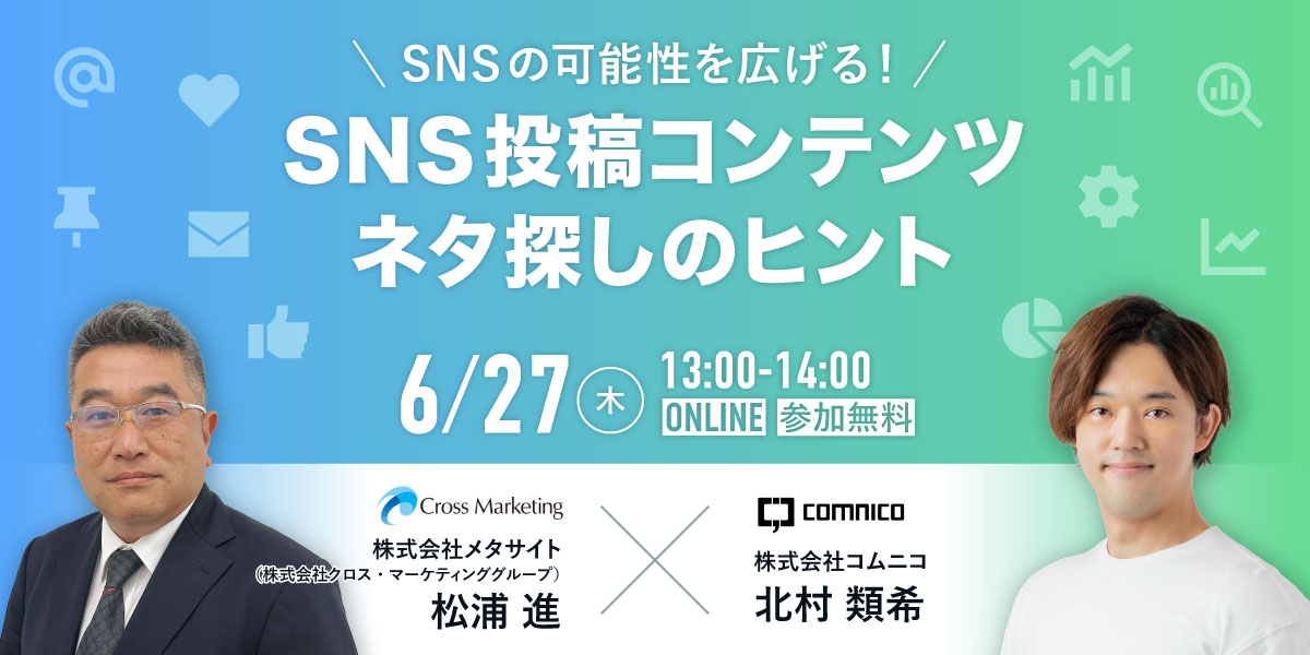 株式会社クロス・マーケティング(本社:東京都新宿区 代表取締役社長兼CEO:五十嵐 幹、以下「当社」)は、株式会社コムニコ(本社:東京都港区虎ノ門 代表取締役:長谷川 直紀、以下コムニコ社)と共催セミナーを6月27日(木)に開催いたします。