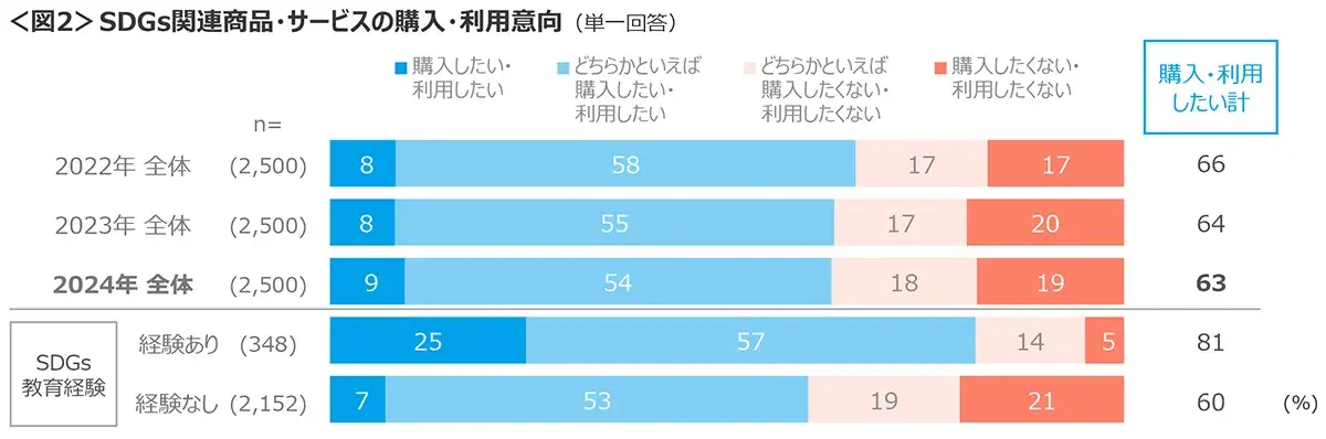 SDGs目標達成のために貢献したい(非常に+やや)は、45%と半数近く。関連商品の購入や利用意向は、63%であり、2022年から微減している。<図1、2>