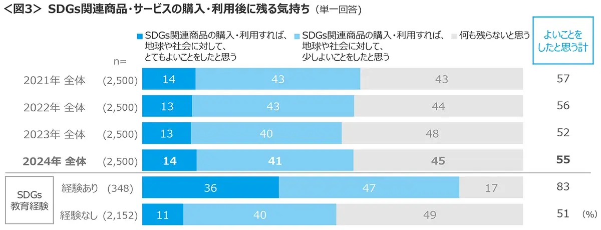 SDGs関連の商品やサービスと知っていて、購入・利用した時にどのような気持ちが残るかを聴取した。”よいことをした”という気持ちが生まれるとした割合は55%と2023年より若干回復している。<図3>