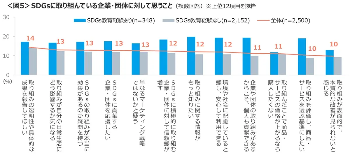 SDGsに取り組んでいる企業・団体への好感度は47%と2021年の水準まで戻りつつある。取り組んでいる企業・団体に対しては、「取り組みの透明性や具体的な成果を報告してほしい」という意見が14%であった。<図4、5>