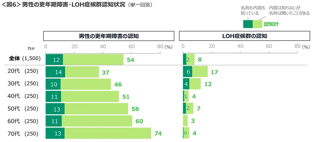 男性の更年期障害について「名称も名前も知っている」は12%で、名称のみ認知も含めると54%と半数を超える。内容認知は年代別に大きな差はないが、名称のみ認知は、年代が上がるほど高まり、70代の認知は74%に達する。LOH症候群の認知は極めて低く1割に満たない。認知率の高い20~30代でも10%台にとどまる。<図6>